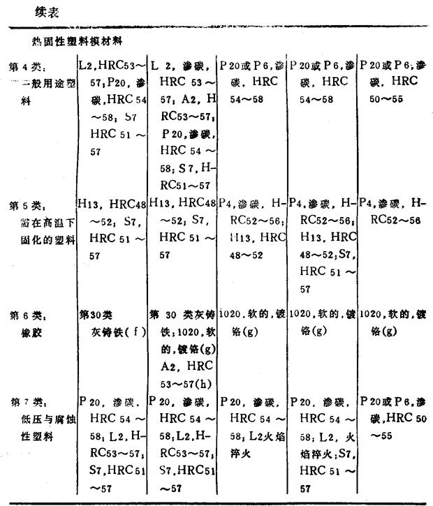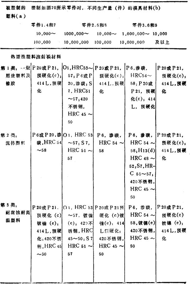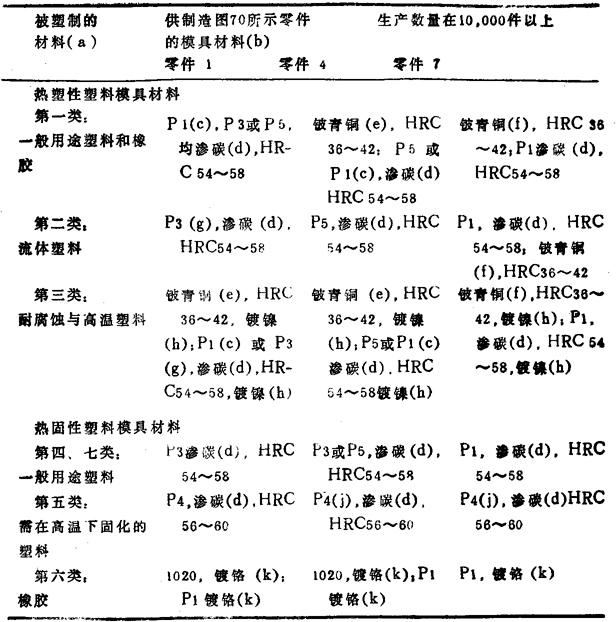 释义 | 模具材料的选择 表88列出用于机加工制成的模具典型材料。模具材料的选择视所要塑制的塑料种类,零件的形状和数量而定。表88所列材料系以模塑难度不同的几种假想零件为基础,各种假想零件如图70所示。表89为型腔冷挤压或铸造的型腔模用的典型材料。 表88表89为用来制造与图示零件形状和难度相似的塑料制品的典型模具材料 表88 制作机加工的型腔模的典型材料 注:(a)见表87。 (b)除另有说明外,遇到在相同条件下列有多种材料时,按排列顺序选用。 (c)预硬化钢的硬度至少为HB300。 (d)推荐供塑制零件5和8。 (e)推荐镀层厚度为0.005~0.025mm。 (f)铸356-Tb铝推荐供零件数量在10,000以下。 (g)推荐镀层厚度为0.005~0.015mm。 (h)对操纵上增加了阻力。 表89 挤压型腔模或铸造型腔模的典型材料 注:(a)见表87. (b)除另有说明外,遇有相同条件下有多种材料时,按排列顺序选用。 (c)当数量超过1,000,000或以上者,不推荐用P1。 (d)当模具在1,000,000件以内能保持精度或在l,000.000件以上要提高抗磨性时,推荐渗碳。 (e)在1,000,000件以上时,不推荐采用铍青铜。 (f)除非能作周期性的替换,否则在件数超过100,000以上时,不推荐采用镀青铜。 (g)当数量超过1,000,000或以上时,推荐P5。 (h)推荐镀层厚度为0.005~0.025mm。 (j)对这种深度的零件,用挤压法来制造P4模腔可能不是一个令人满意的方法。 (k)推荐镀层厚度0。005~0.015mm。 为了补充表88和表89,表90列出供制作塑料型腔膜的铍青铜的成分与性能,这种型腔模是用压铸或陶瓷模铸造而成,特别在模具形状比较简单时,有时也用机加工制成。 表90 用于铸造型腔模的铍青铜的性能和应用 注:(a)在20℃。 (b)97.2Cu-2Be-0.5Co-0.25Si。 (c)97Cu-2.4Be-0.5Co。 (d)96.6Cu-2.6Be-0.5Co-0.3Sl。 机加工型腔模 大型型腔常用机械加工制成,对这种大型型腔,需要高温热处理和快速冷却的钢材可能会受到超量的变形;可能有必要用预硬化模具钢或仅需在较低温度下热处理以得到所需要的抗磨性的那种钢材(如氮化钢或马氏体时效钢)。 挤压型腔模 在很多情况下,小、多型腔的模具可用挤压法制造最为便宜。它就是把称之为“挤压头”的阳主模压入金属块内,这种方法称为“挤压制模法”,如果用这种方法是经济的话,那么型腔模钢必须很软并具有低等级的工作硬度。这种钢材必须渗碳并在热处理以得到所需的抗磨性和表面硬度。 欲求挤压型腔取得满意的结果,不但取决于被挤压的钢材,而且还取决于阳主模钢材合理的选择。供制作阳主模的钢材应具有良好的切削性能和在退火状态下的可加工性、高抗压强度以及在热处理情况下高的抗磨性。阳主模材料的变形要小,热处理中尺寸变化不大,起皮最少以及能高度抛光。 对较简单的、含有棱角但没有翅边的(易于受到边缘磨损或边缘破裂或零件缺损)阳主模,推荐用S1是合适的,推荐硬度为HRC59~61,如在热处理时表面轻度渗碳是很有益的。大多数用阳主模都是属于这一类,因此S1是最广泛地用于主阳模的工具钢。 具有高硬度和良好抗磨性的O1、A2和D2钢,常用来制作结构不复杂的高生产率的阳主模。对这种用途主要要求寿命长,抗鼓凸,而对高韧性一般是次要的,对这种挤压头的硬度推荐在HRC60~63范围以内。对复杂的或复杂结构的挤压头(阳主模)常用6F5工具钢制成,并必须开出坚硬的槽口。这类阳主模常经热处理使硬度达到HRC58~59。不过6F6工具钢对结构复杂而又带翅边的阳主模最为合用。它具有优越的抗脆性,防边缘损伤的良好性能。在热处理过程中有意识的渗碳,常对模具有所帮助。 L6工具钢主要用作便宜的阳主模,将它压入所需挤压力较低的型腔模材料内。 铸造型腔模 许多小型腔和多型腔的模具可用挤压头作为模型来压铸型腔的办法制造。 用于压铸铍青铜的挤压头必须具有在高温下抗软化能力,因而能在热态下工作的钢如H13常常被选用于这种用途。 其它型腔模材料 除了表88所列有磨蚀的材料之外,马氏体时效钢常用来制造大型模具,特别用于有磨蚀性塑料的模具。马氏体时效钢仅要求在480℃下筒单地时效处理数小时就可得到全硬,视钢种不同,硬度在HRC50~58之间。时效钢的淬硬并不决定于快速冷却,因而在厚实部分也能达到全硬。为了加强抗磨性,马氏体时效钢模腔可以氮化处理。 腐蚀对塑料模是个大问题,腐蚀的原因是由于塑制具有腐蚀性的塑料如聚氯乙烯和因生锈引起冷却水管的堵塞。对聚氯乙烯塑料模常用镀铬的办法来解决,但是这种电镀不能防止水管生锈。近年来已有了不锈型腔模钢,不锈型腔模钢除具有像P20型腔模钢的优点之外,还有很高的抗腐蚀能力。有两种可以用作型腔模用钢即414L和420。414L可以预硬到约HB300,对用于注射模是很理想的;420可以热处理到HRC50,用它制造注射与压铸模都是合适的。 作为表89所列材料的补充,对有腐蚀性塑料的小制品,在批量生产时,应考虑用粉末冶金制成的小模具或模具镶块。供这种用途的最成功的P/M材料的成分为94.5~98.5Fe,0.25~0.75C,1.0~3.0Ni,Cu为0,其余最大为2.0。 有一种用电成型的称之为“镀层模”的模具,特别对某些工件要求有精美型腔的模具很有用,这种加工方法是用电沉积一层很薄的硬镍于模腔上,接著镀上一层软镍或铜。 为了延长易磨损部位的寿命,如进料口镶块,把可切削加工的钢结硬质合金加工成镶块的形状,然后热处理达到硬度HRC68。 |