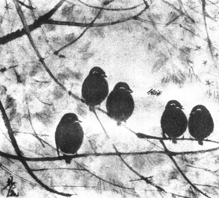 【作品赏析】: 林风眠探索新的中国画,既画人物、仕女、风景,也画花鸟、静物……。 他喜爱刻画鹜、鹭、鱼鹰、鹤;喜爱把他笔下的鸟儿安排在宁静的环境之中。此帧《樱花小鸟》,在方构图中刻画樱花枝叶。横斜的嫩枝由左而右,由上而下,穿插交错;花叶都在枝的后面,由桔黄、淡紫加淡黑及白谱成漂亮的灰色调。五只小鸟栖于枝上,都正面对著观众。 它们均以墨为基调,掺以少量赭石,唯眼睛上缘留白,余皆为深色。画家给它们安排的世界是美丽而纯静的,春光明媚,一片平和。它们不飞不跳,似乎是在尽情享受著世界的爱抚,又象是在孤独地静观著。林风眠花鸟画的境界往往带有一点孤寂的、空漠的情调,但又很美,很和谐,很有力量感。大约这与画家的内向性格和生活遭遇有关。他探索平和而美、粗犷而纯粹的审美境界,往往不能得到社会的理解和支持,他在作品中寄托的情怀,正是他的理想与他的现实感的微妙结合。 。  现代 林风眠 纸本水墨设色 |