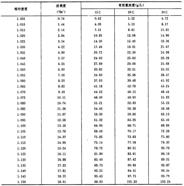 表1-9-2 次氯酸盐漂液的相对密度与有效氯浓度的关系
