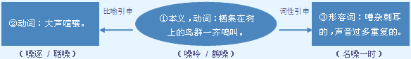 文言版《説文解字》:喿,鳥群鳴也。从品,在木上。附《说文解字》:喿,鸟群鸣叫。字形采用“品”作边旁,像很多鸟站在树上鸣叫。