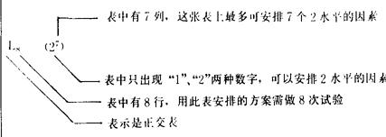 多因素试验的设计方法。 正交设计借助现成的正交表来按排试验方案并进行数据处理。正交设计的主要步骤是: (1)确定试验的指标、因素和水平。试验的指标就是试验最终要取得的关于试验对象的结果;试验因素是指试验中有几个自变量就有几个因素;水平数是指各因素在试验中采取几个试验值的数目。一般各因素的水平数应当一致。 (2)按照试验的因素和水平选取合适的正交表。正交表是已经制作好的规格化的表,它是正交设计的工具。 以 (见下)为例说明正交表符号的意义。  (3)选好正交表后,按正交表按排试验。 其具体步骤如下: 第一步,排表头。 按正交表中的格式把各因素名称按一定次序填写到表上行的几个空格中。 第二步,各因素水平对号入座。按照事前对各因素水平哪个为“1”,哪个为“2”的确定,依照正交表中每列因素排列次序,把各水平对应的条件值写入表中。 第三步,按每个试验号所对应的每一行的条件,做试验,并把结果填写在同一行的最后一列中。 (4)按照正交表设计的试验,可全面地反映各因素采取不同水平对试验结果产生的不同影响。 正交设计数据的分析处理,可以得到关于哪个因素对结果影响最大,最佳试验结果的取得要求各因素采取哪种水平以及进一步试验的方向是什么等问题的结论。 的正交表
