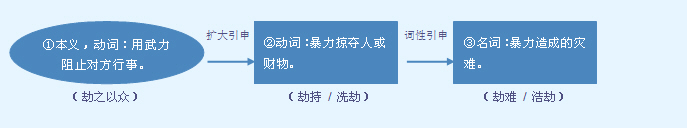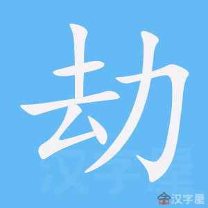 字源解说 劫,金文 = (力,“劝”的省略,表示阻止)+ (去,前往),表示阻止前往。造字本义:用武力阻止对方行事。篆文 将金文的上下结构调整为左右结构。 附 文言版《説文解字》:劫,人欲去,以力脅止曰劫。或曰以力止去曰劫。 附 白话版《说文解字》:劫,当有人想要前往,用武力胁迫阻止他,就叫“劫”。有的人分析字形说,以“力”止“去”就叫“劫”。 引申线索