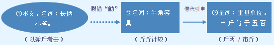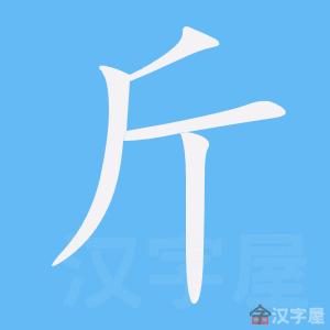 字源解说 本 字“斤” 斤,甲骨文 像曲柄 顶端带有尖锐刀锋 的金属工具。造字本义:一种比斧子更小的砍凿工具。金文 严重变形,将甲骨文的单笔图形,拆分成两个部分,将甲骨文字形中的刀锋形象 写成不知所云的 ,将甲骨文字形中曲柄形状的 写成 ,刃形、斧形消失。篆文 在金文基础上继续变形。隶书 将甲骨文字形中表示刀锋的 写成“丁”形 。为了强调“斤”的金属性质,篆文异体字 再加“金” 另造“釿”代替。古籍多以“斤”代替“釿”。假借字“觔” 觔,是形声字,“力”是声旁,“角”是形旁,表示与牛角有关。造字本义:用牛角制成的容具。 附 文言版《説文解字》:斤,斫木也。象形。凡斤之屬皆从斤。 附 白话版《说文解字》:斤,砍木头的斧子。字形像斧头的形状。所有与斤相关的字,都采用“斤”作边旁。 引申线索