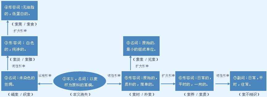 释义 | ![]() ❶ 颜色清淡,不艳丽: ~雅|~淡|~净|~面朝天|她向来穿得很~。 艳 yàn ~丽|~妆|鲜~|浓~。 ❷ 鱼、肉类以外的蔬菜、瓜果类食物: ~菜|老人历来吃~|现在有不少年轻人都爱好~食。 荤 hūn ~腥|出家人不吃~|你干体力活,不吃点~可不行。 本色,白色;颜色单纯,不艳丽。能受程度副词修饰。用于口语。 a.作谓语,可带补语。 白色的床单太~了|这块布料颜色和花儿都~得很。 b.作定语。 ~车白马|穿着~色衣裙。 ❶蔬菜瓜果等食物。能作主语、宾语。 三荤一~摆在桌上|老大娘信不信佛?吃不吃~? ❷带有根本性质的物质。用作语素构成合成词。 元~|因~|激~|要~|色~|词~|毒~。 素来、向来。用在单音节动词前面作状语。还能构成“素以……著称”“素有……之称”的格式。用于书面语。 他二人~不相识,~无交往|古城历史悠久,古迹很多,~有露天博物馆之称|黑龙江~以草原广大肥美著称。 【近】 〈形〉淡 【反】 〈形〉艳 花 〈名〉荤 腥 【词语】 素菜 素餐 素服 素净 素昧平生 素描 素朴 素日 素食 素数 素席 素雅 素质 字源解说 索,既是声旁也是形旁,表示编绳子。素,金文 ![]() ![]() ![]() ![]() ![]() ![]() ![]() ![]() ![]() ![]() ![]() 附 文言版《説文解字》:素,白緻繒也。从糸 ![]() 附 白话版《说文解字》:素,未染色的白色原丝织成的丝品。字形采用“糸、 ![]() 引申线索 ![]() 【字族索引】 素 【同音字】 sù |