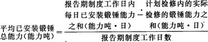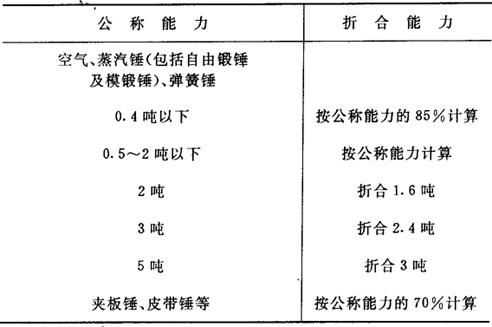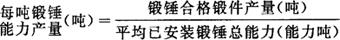 指报告期每吨锻锤能力所生产的锻件合格品量。 它是反映锻锤能力利用程度的指标,是核算和平衡锻件生产能力的重要参考指标之一。其计算公式如下:  式中,“锻锤合格锻件产量”,是指完成锻造车间最后一道工序,经检验合格并已办理入库手续的锻锤锻件,扣除外车间发现属于锻造责任的废品量。同一锻件经过不同规格的锻锤锻造,不应重复计算。“平均已安装锻锤总能力”,是指报告期平均每日已安装锻锤能力的总和。 包括已安装而封存的设备。计算公式如下:  计算每吨锻锤能力产量时,为便于各种锻锤对比,需将各种不同锻锤能力加以折合。其折合系数如下表:  |