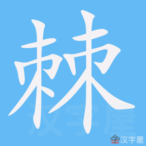 字源解说 “朿”是“棘”的本字。朿,甲骨文 像一棵树上 长满尖刺 ,像荆棘。有的甲骨文 淡化树形,将荆棘的尖刺形状简化成 。造字本义:树木或灌丛的棘刺。金文 将甲骨文字形中的横“工” 写成“冂” 。篆文 强化了“木” 的形象,表示木本植物的荆刺。隶化后,印刷体楷书 将篆文的横“工” 写成“冂” 。当“朿”的“荆刺”本义后,金文 再加一个“朿” 另造“棘”代替,以“重朿”强调荆刺“丛生”。篆文 承续金文字形。 附 文言版《説文解字》:棘,小棗叢生者。从並朿。 附 白话版《说文解字》:棘,小荆刺丛生的样子。字形由两个并列的“朿”的会义。 引申线索