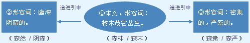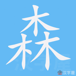 字源解说 森,甲骨文 左中右并列三(众多)个“木” ,表示林大树多。有的甲骨文 写成上下结构。造字本义:树木茂密丛生。篆文 承续甲骨文字形。“木”是象形字,甲骨文 像一株树,上部是枝下部是根;“本”是指事字,金文 在树根部位加三点指事符号,表示树在地下的营养器官;“末”是指事字,金文 在树梢部位加一点指事符号,表示尾端; “未”是象形字,甲骨文 像树上枝桠重重,表示枝叶茂盛;“果”是象形字,甲骨文 像树上结满球状实籽;“朱”是指事字,甲骨文 在主杆部位加一点指事符号,表示树干;“林”是会义字,甲骨文 像树连树的样子;“森”是会义字,甲骨文 比“林”多一“木”,表示“森”为“大林”。 附 文言版《説文解字》: 森,木多皃。从林从木。 附 白话版《说文解字》: 森,树木极多的样子。字形采用“林、木”会义。 引申线索