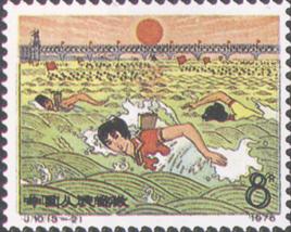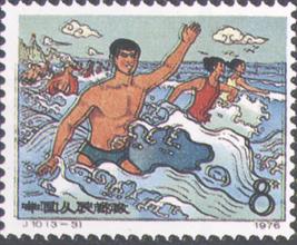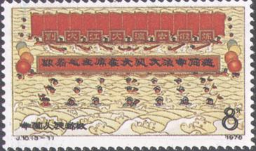 释义 | 毛主席畅游长江十周年 发行日期:1976年7月16日 齿孔度数: 印刷版别:影写版 票幅:(1)52×31;(2)(3)31 全张枚数:(1)40(4×10);(2)(3)50(5×10) 设计者:任宇 印刷:北京邮票厂 (1)8分 跟著毛主席在大风大浪中前进 1000万枚 (2)8分 万里长江横渡 1000万枚 (3)8分 到大江大海去锻炼 1000万枚 (1)-(3) 3枚全 |
