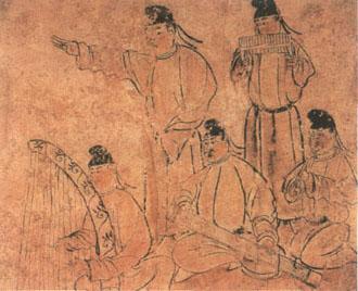 依据在中国河南省舞阳县新石器遗址发掘出土的16支骨笛的碳14测定,中国音乐的历史可追溯至七八千年之前。 这些骨笛音孔的分布表明,中国音乐的水准在当时已经达到了相当高度。 秦、汉之后至唐朝的1200余年间,歌舞大曲是中国音乐的主要形式。 进人隋唐时代,这一现象有了改变,佛教寺院的庙会成为平民的音乐活动园地,酒楼食肆亦常有诗歌吟唱。到了宋代,“勾栏”、“瓦肆”、“戏楼”及“茶馆”等地均成为音乐舞蹈艺术演出的场所,并出现了鼓子词、杂剧、南戏等诸多音乐艺术表演形式。宋代以后,与“平民音乐”同时得到较大发展的还有“文人音乐”,以琴乐为主,琵琶、筝、笛、箫等乐器也得以进一步发展。明清时期,说唱和戏曲的艺术品种日益成熟和丰富,如弹词、大鼓、牌子曲、昆曲等,构成这一时期音乐艺术极为重要的两大载体。 发展比较迟缓的乐器到了清代也开始成熟,以胡琴为主的弓弦乐器在为戏曲伴奏及与拨弦乐、吹管乐的合奏等方面显示出越来越重要的作用。  苏思晟墓壁画——右侧五人,前排三人跽坐,分持竖笛、七弦琴和箜篌,后排二立者,一吹排箫,一为乐队指挥。 |