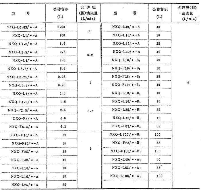 释义 | 气囊式蓄能器的产品 气囊式蓄能器技术参数见表7.7-21,型号意义说明如下: ❶ -气囊式蓄能器❷ -联接形式(L为螺纹联接,F为法兰联接)❸ -公称容积❹ -公称压力❺ -结构类型 表7.7-21 气囊式蓄能器技术参数 注: ❷ 允许充气压力范围应小于液压系统最低工作压力的90%,大于液压系统最高工作压力25%。 ❸ 允许用石油基液压油;气囊中充氮气。 |