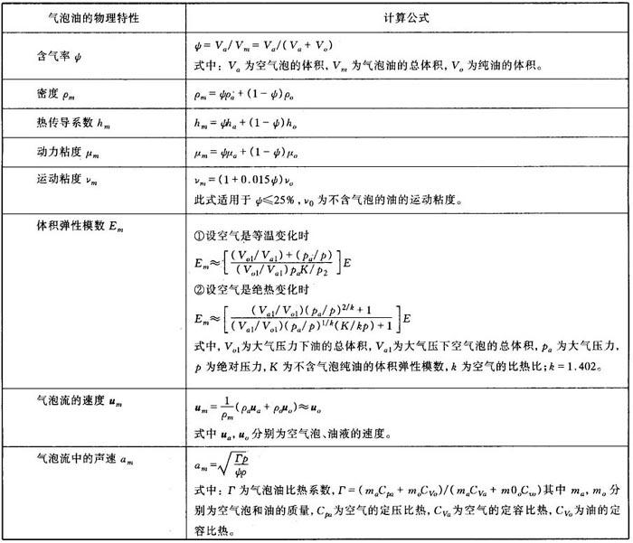 释义 | 气泡油的物理特性 少量空气以气泡状掺混于大量的油液中,称之为气泡油,而流动的气泡油实质上是液—气二相流,称为气泡流,这种气泡流对液压系统的动特性影响很大,使液压系统的刚性不足,反应迟滞,并可能出现“爬行”现象等不良后果。 为了分析方便,常将气泡流看作一个混合物整体,下标以m表示,空气泡及油的下标分别以a与o表示,气泡油常用的几个物理特性计算公式列于表1.6-1。 表1.6-1 气泡油(流)的物理特性 |
