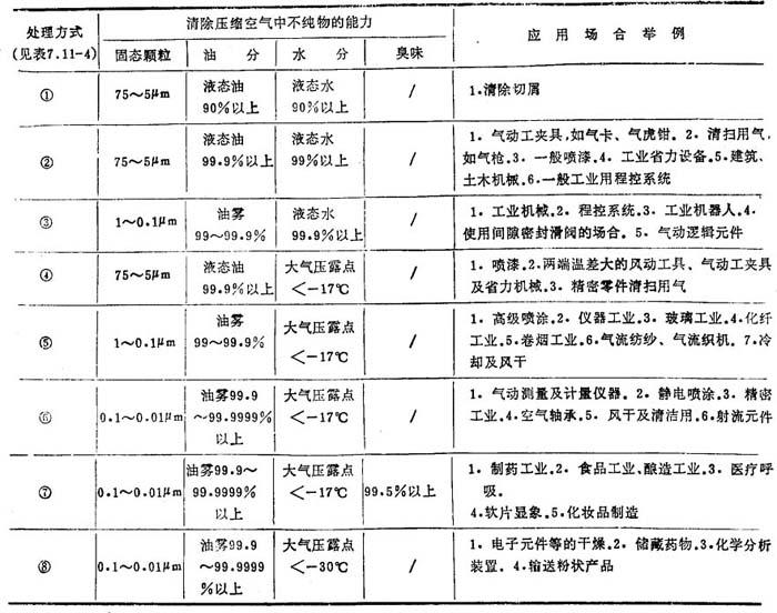 释义 | 气源系统及辅助元件的选择 压缩空气中的油份、水份和固态颗粒等杂质,可导致气动元件腐蚀、磨损和阻塞,引起系统效率的降低,甚至产生误动作。除在气动装置前直接安装过滤器、减压阀和油雾器外,根据对压缩空气清洁度的不同要求,在空气压缩机之后,必须设置相应的气源处理元件。气源处理系统参见表7.11-4,各处理方式的能力和应用见表7.11-5。 表7.11-4 气源处理系统 空气压缩机的选择:空压机的排气量 QM≥K1·K2·K3·Qa(m3/min)(ANR)(7.11-9) 式中 Qa为气动系统的理论平均耗气量(m3/min)(ANR)K1为漏损系数(考虑各气动元件、管道接头等处的泄漏),取1.15~1.5;K2为备用系数(考虑各工作时间内用气量不同以及可能增添新的气动系统),取1.3~1.6;K3为利用系数(考虑气动设备较多时不会同时使用),设备少时可取为1,设备多时取值小于1。空压机的额定排气压力以比系统最高工作压力高0.2MPa为宜。 储气罐容积V的选择: 式中 Qmax为气动系统的最大耗气量(dm3/min)(ANR);QM为空压机的排气量(dm3/min)(ANR);p为气动系统工作压力(MPa):t为气动系统的工作时间(s)。 各辅助元件的选择原则如下: ❶ 冷冻式干燥器的选择:在规定进气压力和进气温度下,需要处理的气量不应超过干燥器能处理的气量。若环境温度高于标定值,每高5℃,应将需要处理的气量增加5%。 ❷ 过滤器的选择:其品种可根据对压缩空气清洁度的要求及是否自动排水等选用,通径按额定流量(参见表7.11-1)的限制选择。组合辅助元件按需要处理的最大耗气量应不超过该元件在额定工作压力下的额定流量来选择通径。 ❸ 主管路的选择:管路的内径和长度,可按在通过最大耗气量时,主管路的总压力损失不超过0.05MPa来选择。厂区管内流速一般为10m/s,车间管内流速一般为15~25m/s。 ❹ 油雾器的选择:其通径主要根据油雾颗粒大小以及通过流量不超过额定工作压力下的额定流量(参见表7.11-1)选择。 表7.11-1 控制阀的额定流量❶ 注: |