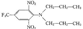 又称茄科宁。 苯胺类选择性芽前土壤处理除草剂。化学名称:2,6-二硝基-N,N-二正丙基-4-三氟甲基苯胺。化学结构式如下。 纯品为橙黄色结晶固体,熔点48.5~49℃,25℃时蒸气压为137.32×10-4Pa。 几乎不溶于水,易溶于丙酮、二甲苯等溶剂。易挥发,易光解,在土壤中能被土壤胶体吸附固定,不易淋溶和冲刷。药剂通过杂草的胚芽和下胚轴吸收,影响细胞激素的形成和传递,抑制细胞分裂而导致杂草死亡。杀草谱广。 棉花、大豆、油菜、花生、马铃薯、瓜类使用,防除一年生禾本科杂草和苋、藜、繁缕、蓼、萹蓄等阔叶杂草。对人、畜低毒,大鼠急性口服LD50>10000mg/kg,兔急性经皮LD50>2000mg/kg,对鱼类有高毒。