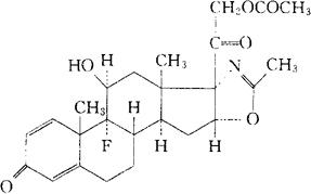| 释义 | 氟扎可特 C25H30FNO6=459.51 CAS-19888-56-3 (5′β,11β)-21-(乙酰氧)-9-氟-11-羟-2′-甲基-5′H-孕甾-1,4-二烯17,16-d噁唑-3,20-二酮。 (5′β,11β)-21-(Acetyloxy)-9-fluoro-11-hydroxy-2′-methyl-5′H-pregna-1,4-dieno 17,16-d oxazole-3,2O-dione. 9-氟-11β,21-二羟-2′-甲基-5′βH-孕甾-1,4-二烯17,16-d噁唑3,20-二酮。 9-Fluoro-11β,21-dihydroxy-2′-methyl-5′βH-pregna-1,4-dieno 17,16-d oxazole-3,20-dione. 肾上腺皮质激素类药,消炎药。 Fluazacort,L-6400,Azacortid.Fluazacortenol Acetate. INN,USAN.