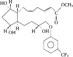 C24H29F3O6=470.49 CAS-62559-74-4 (2E,5Z)-7-[(1R,2R,3R,5S)-3,5-二羟-2-[(E)(3R)-3-羟-4-(α,α,α-三氟-间-甲苯基)氧]-1-丁烯基]环戊基-2,5-庚二烯酸甲酯。 Methyl(2E,5Z)-7-[(1R,2R,3R,5S)-3,5-dihydroxy2-[(E)-(3R)-3-hydroxy-4-(α,α,α-trifluoro-m-tolyl)oxy]-1-butenyl]cyclopentyl]-2,5-heptadienoate。 7-[3,5-二羟-2-[3-羟基4-[3-(三氟甲基)苯氧]丁烯基]环戊基]-2,5-庚二烯酸甲酯。 7-[3,5-Dihydroxy-2-[3-hydroxy-4-[3-(trfluoromethyl)phenoxy]butenyl]cyclopentyl]-2,5-heptadienoic acid methyl ester. Froxiprost,ONO 995. 前列腺素类药,平滑肌肌肉收缩药。 INN,USAN.  |