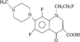 C17H18F3N3O3=369.34 CAS-79660-72-3 6,8-二氟-1-(2-氟乙基)-1,4-二氢-7-(4-甲基-1-哌嗪基)-4-氧代-3-喹啉羧酸。 6,8-Difluoro-1-(2-fluoroethyl)-1,4-dihydro-7-(4-methyl-1-piperazinyl)-4-oxo-3-quinolinecarboxylic acid. 抗菌药。 Fleroxacin,Ro 23-6240/000,AM 833,Quinodis. INN,USAN.