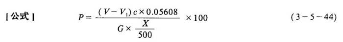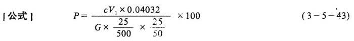 释义 | 氧化钙及氧化镁含量的测定 1.氢化镁的测定计算 ]测定方法]吸取250mL已除尽铁、铝的试液(见上)置于250mL的烧杯中,用水稀释至60mL,加入4mL10%钨酸钠溶液,再加入氢氧化铵(1∶1)中和至溶液pH值约为8~9。微火加热至80~90℃,并不断搅拌,但勿触及杯壁与底,使之沉淀,蒸浓至40mL,移入50mL容量瓶,在流水中冷却,放置20min钟,再加水稀释至刻度。用干的紧密滤纸及漏斗过滤,弃去最初滤出的少量滤液。吸取25mL滤液于250mL锥形瓶中,加入5mL铵盐缓冲液,4滴铬黑T指示剂,用0.025mol/L EDTA标准溶液滴定至恰现浅蓝色。 式中 P——氧化镁含量(%) c、V1——EDTA标准溶液的浓度(mol/L)及滴定所耗用的体积(mL) G——试样重(g) 0.04032——与1mL1mol EDTA溶液相当的氧化镁的量(g) 2.氧化钙的测定计算 [测定方法]吸取一定量测定铁及铝后所保留的溶液于250mL锥形瓶中,用氨水中和,加入5mL铵盐缓冲液及4滴铬黑T指示剂,用0.025mol/L EDTA标准溶液滴定至恰现浅蓝色(此为镁、钙总量)。 式中 V——滴定钙、镁总量时耗EDTA体积(mL) X——吸取样品溶液体积(mL) P——氧化钙含量(%) 其它同式3-5-43 |