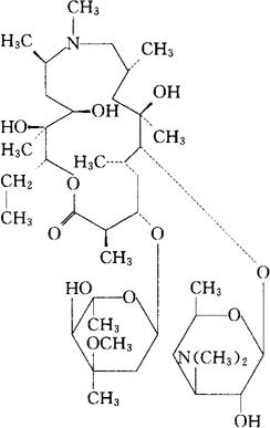 C38H72N2O12=749.00 CAS-83905-01-5 (2R,3S,4R,5R,8R,10R,11R,12S,13S,14R)-13-[2,6-二脱氧-3-C-甲基-3-O-甲基-α-L-己吡喃核糖基)氧]-2-乙基-3,4,10-三羟基-3,5,-6,8,10,12,14-七甲基-11-[[3,4,6-三脱氧-3,-(二甲氨基)-β-D-己吡喃木糖基]氧]-1-氧杂-6-氮杂环十五烷-15-酮。 (2R,3S,4R,5R,8R,10R,11R,12S,13S,14R)-13-[(2,6-Dideoxy-3-C-methyl-3-O-methyl-α-L-ribohexopyranosyl)oxy]-2-ethyl-3,4,-10-trihydroxy-3,5,6,8,10,12,14-heptamethyl-11-[[3,4,6-tri-deoxy-3-(dimethylamino-β-D-xylo-hexopyranosyl]oxy]-1-oxa-6-azacyclopentadecan-15-one. 9-脱氧-9a-氮杂-9a-甲基-9a-高红霉素A。 9-Deoxo-9a-aza-9a-methyl-9a-homoerythromycinA. 抗生素类药。大环内酯类广谱抗菌(含厌氧菌)。 阿齐红霉素,阿红霉素。 Azithromycin,CP-62,993,XZ-450,Sunamed. INN,BAN,USAN.
