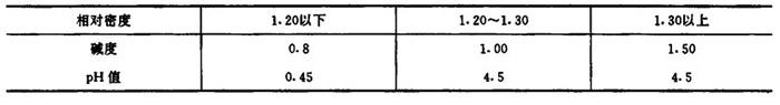 【说明】 氯化锌溶液中杂质含量超过以下数值时需进行净化。含铁量≥0.042%,含钙量≥0.4%,含铜量≥0.025%。 1.除钙所需硫酸锌加入量的计算 【说明】 硫酸锌除钙的反应式为: ZnSO4+CαCl2→CαSO4Z↓(nCI2 【公式】 M=4.03VG (1-17-22) 式中 M——硫酸锌加入量(g) V——氯化锌容积(mL) G——每mL氯化锌液中含钙的毫克数(mg/mL) 2.除铁所需氯化钾加入量 【说明】 除铁反应式为: 6FeCI2+KCIO3+6HCI→FeCI3+KCI+3H2O 【公式】 Q=0.364VG (1-17-23) 式中 Q——氯酸钾加入量(g) V——氯化锌容积(L) G——每mL氯化锌液中含铁的毫克数(mg/mL) 3.氯化锌液调节碱度所需碳酸钠的量计算 【公式】  式中 N——硫酸钙加入量(g) V——氯化锌液容积(gL) d——氯化锌液比重 c——氯化锌液浓度(%) A——要求的碱度值 B——调节前溶液的碱度〔如是酸度时为(-B)〕 r——碳酸钠的纯度(%) 【附表】 氯化锌溶液的相对密度、碱度与pH值之间的关系见表1-17-9。 表1-17-9 氯化锌液相对密度、碱度与pH值的关系  |
