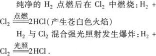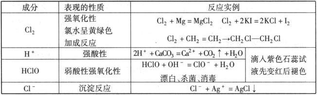 释义 | 氯气的化学性质 1.与金属反应: 注意 ❶ 除Pt、Au外的大多数金属都能与氯气反应生成相应的金属氯化物. ❷ Cl2与变价金属(如Cu、Fe)反应生成高价金属氯化物. 2.与H2反应: 注意 物质的燃烧不一定要有氧气参加,任何发光、发热的剧烈的化学反应,都是属于燃烧. H2与Cl2反应生成的HCl气体具有刺激性气味,极易溶于水.HCl气体的水溶液叫氢氯酸,俗称盐酸. 3.与水反应: 氯气不仅能溶于水且溶解的Cl2有一部分与水反应. 新制氯水中存在三种分子(Cl2、H2OHClO),四种离子(H+、Cl—、ClO—、OH—).氯水成分的复杂性决定了氯水性质的多样性 注意 ❶ 久置的氯水由于Cl2不断与H2O反应和HClO的分解,最后变成稀盐酸. ❷ Cl2使湿润的有色布条褪色而不能使干燥的有色布条褪色.原因是Cl2本身没有漂白性,真正起漂白作用的是Cl2与H2O反应生成的HClO. 4.与碱溶液反应: 常温下,Cl2与碱溶液反应: 氯气+碱→氯化物+次氯酸盐+水 如:Cl2+2NaOH=NaCl+NaClO+H2O 2Cl2+2Ca(OH)2=CaCl2+Ca(ClO)2+2H2O 注意 ❶ 漂白精(或漂白粉)的主要成分为Ca(ClO)2和CaCl2,其有效成分为Ca(ClO)2. ❷ 漂白精的漂白原理: Ca(ClO)2+CO2+H2O=CaCO32HClO Ca(ClO)↓(2+2HCl=CaCl2+2HClO 由于反应生成HClO,所以漂白精具有漂白作用,又由于Ca(ClO)2能与CO2、H2O反应所以漂白粉或漂白精应密闭保存. 5.与其他还原性物质反应: Cl2+2KI=2KCl+I2 Cl2+H2S=2HCl+S Cl2+2FeCl2=2FeCl3 Cl2+H2O+Na2SO3=Na2SO4+2HCl 6.与有机物反应: 加成反应:如Cl2+CH2=CH2→CH2ClCH2Cl |