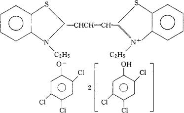 C27H23Cl3N2OS2·(C6H3Cl3O)2=957.76 CAS-5779-59-9 系-分子3-乙基-2-[3-(3-乙基-2-苯并噻唑啉亚基)丙烯基]-苯并噻唑鎓2,4,5-三氯酚盐与二分子2,4,5-三氯酚的混合物。 Mixture of one molecule of 3-ethyl-2-[3-(3-ethyl-2-benzothiazolinylidene)propenyl]benzothiazolium 2,4,5-trichlorophenate and two molecules of 2,4,5-trichlorophenol. 抗蠕虫。 阿拉扎宁三氯酚盐。 Alazanine Triclofenate. INN,USAN.  |