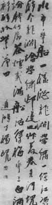 释义 | 水市华船诗轴 【简介】: 淸·杨岘书。纸本。行书。七言律诗一首。凡四行,共六十一字。刊于日本《明淸书道图说》。 【赏析】: 杨岘此行书,笔势遒劲,无一点尘俗气。从结体上看,字形一般较长,大都向左上取势,写得比较瘦劲凝练。其字虽写得略爲淸淡,但却包含著丰神绝俗的神韵。杨岘书写得比较注重劲力,结体欹正变化,节奏强烈,行笔有桀骜不驯之势。作者也十分讲究笔情墨趣,虽不拘常法,但亦自有法度。通篇做到笔墨浓淡调融,显得气象万千。可见杨岘此行书,以情性爲上,以豪纵见胜,体现了气势、活力和精神,而不是故作姿态去摆布位置。 |