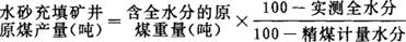 释义 | 水砂充填矿井原煤产量 指用水砂充填矿井采煤法开采的原煤产量。 其计算公式为: 有炼焦煤洗煤厂和动力煤洗煤厂的矿井,其原煤产量应按规定的精煤计量水分进行折算;对没有炼焦煤洗煤厂和动力煤洗煤厂的矿井,其原煤产量按规定的全水分折算。但实测水分不超过规定的全水分者,不再折算。 |