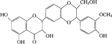 释义 | 水飞蓟宾 C25H22O10=482.44 CAS-22888-70-6 3,5,7-三羟-2-[3-(4-羟-3-甲氧苯基)-2-(羟甲基)-1,4-苯并二噁烷-6-基]-4-苯并二氢吡喃4-酮。 3,5,7-Trihydroxy-2-[3-(4-hydroxy-3-methoxyphenyl)-2-(hydroxymethyl)-1,4-benzodioxan-6-yl]-4-chromanone. 保肝药。 益肝灵,西里马灵,利肝隆。 Silibinin,Silybin,Silybum Substance E6,Legalon,Hepadestal,Silibancol. INN,DCF,USAN. |