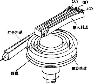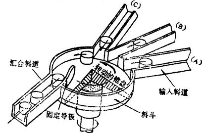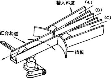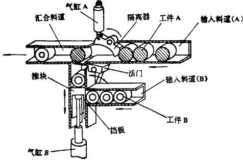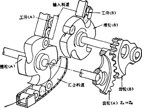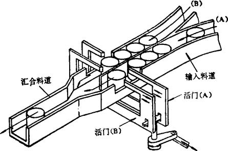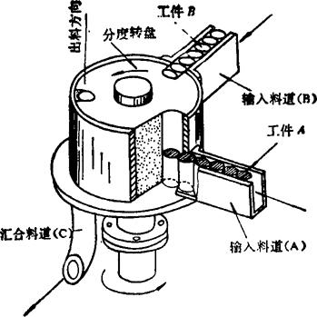 释义 | 汇合机构示例 在自动化生产线上,有的需要由几台供料装置对一台工作机进行供料;或者将几台工作机加工后的工件汇集在一条线上,进行检测、记数等。为此,就需要采用汇合机构。 例5.14-44 摆动滑道汇合。如图示,在多个径向排列的输入料道前端有一作摆动的汇合料道,该汇合料道按顺序对准每个输入料道,并作停歇,以接收工件。圆弧形挡板的作用是挡住非对准汇合料道的件。 例5.14-45 旋转底盘汇合。如图示,由多个输入料道来的工件全部进入汇合于料斗,有一定锥度的底盘在料斗中旋转。在离心力和固定导板的作用下,使工件进入汇合料道,这种装置不要求多个输入料道的输件节拍相同。 例5.14-46 螺旋轨道汇合,如图示,由多个输入料道来的工件在料道末端分别落入螺旋形轨道的不同半径处槽内,该螺旋形轨道固定不动,由底盘的旋转,带动工件顺螺旋线送到出口处,进入汇合料道, 例5.14-47 梭式活门汇合,如图示,在两个平行输入料道的末端分别设有作反向连动的活门A和B,两活门作反向往复移动,分别对输入料道中的工件作挡料和放料动作,这样,便把两输入料道中的工件逐个相间地汇合到一个输出料道, 例5.14-48 旋转槽轮汇合。如图示,在两个输入料道末端分别设有反向旋转的槽轮。每个槽轮的外周均匀分布若干个和工件形状相适应的槽。当槽轮转动时,槽口对准输入料道时接收工件,再转动一角度后,便把工件送落到汇合料道。两槽轮的转速和位置差有协调要求,这是通过一对齿轮A和B的传动来实现的。这样,便可交替地将两个输入料道的工件(可以是配套的不同工件,但要求形状一致)汇合到汇合料道。 例5.14-49 分度转盘汇合。如图示,两输入料道A和B径向分布在分度转盘的外侧,两者轴向位置不同,分别位于分度转盘的下半部和上半部。分度转盘旋转时,槽口先对准输入料道A,下半部接收工件A,再对准输入料道B,上半部接收工件B;转到对准汇合料道C时,工件A和B一起落入汇合料道。为保证接收和送出工件的可靠性,分度转盘应作间歇运动。 例5.14-50 可控式汇合。如图示,输入料道A和B上下排列,上料道A的末端有气缸A驱动的摆动隔离器;下料道B的末端有气缸B驱动的移动推块,以及与推块连动的活门。两气缸有控制地协调工作。当下气缸B和推块处于最低位置接收工件时,活门关闭,上气缸A使隔离器释放一工件A,进入汇合料道;当上气缸A使隔离器变换位置而阻挡工件时,下气缸B使推杆向上送工件,同时活门打开,工件B被送入汇合料道。如此循环工作,即可交替将工件A和B送入汇合料道。改变对气缸A和B的控制,可以改变进入汇合料道工件A和B的比例。 |