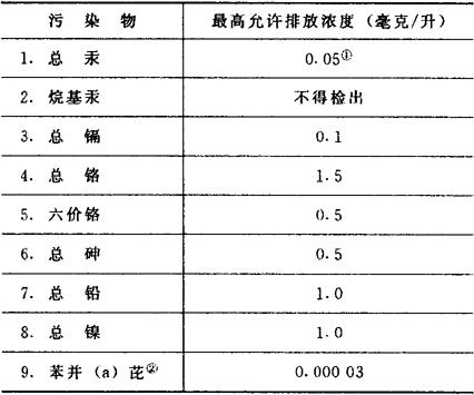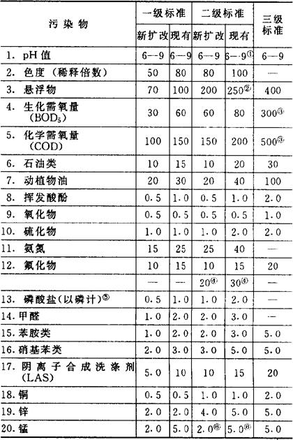 国家为了控制水污染,保护江河、湖泊和海洋等地面水体以及地下水体水质的良好状态,保障人体健康、维护生态平衡,根据特定水域的水质要求,规定的污水和废水中污染物的最高允许排放浓度。 中国1988年颁布的《污水综合排放标准》,适用于排放污水和废水的一切企、事业单位。该标准按地面水使用功能要求和污水排放走向,对向地面水水域和城市下水道排放的污水,分别执行一、二、三级标准。 对于特殊保护水域,如海水浴场和水产养殖场等水体,不得新建排污口。对于重点保护水域,如一般经济渔业区和风景游览区,排入本区水域的污水执行一级标准。对于一般保护水域,如港口和海洋开发作业区,排入本区的污水执行二级标准。对排入城市下水道并进入二级污水处理厂进行生物处理的污水执行三级标准。将排放的污染物按其性质分为二类。 表1 第一类污染物最高允许排放浓度  ❶ 烧碱行业(新建、扩建、改建企业)采用0.005毫克/升。 ❷ 为试行标准,二级、三级标准区暂不考核。 表2 第二类污染物最高允许排放浓度(毫克/升)  ❶ 现有火电厂和粘胶纤维工业,二级标准pH值放宽到9.5。 ❷ 磷肥工业悬浮物放宽至300毫克/升。 ❸ 对排入带有二级污水处理厂的城镇下水道的造纸、皮革、食品、洗毛、酿造、发酵、生物制药、肉类加工、纤维板等工业废水,BOD5可放宽至600毫克/升,CODcr可放宽至1000毫克/升,具体限度还可以与市政部门协商。 ❹ 为低氟地区(系指水体含氟量<0.5毫克/升)允许排放浓度。 ❺ 为排入蓄水性河流和封闭性水域的控制指标。 ❻ 合成脂肪酸工业新扩改为5毫克/升,现有企业为7.5毫克/升。 |