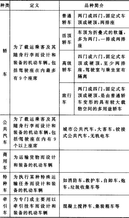 一般地,汽车是根据其用途、源动力装置的种类、构成方式、车身形式和法律及标准等不同方面进行分类的。 依照国际标准ISO3848可将汽车分为轿车、公共汽车、商用汽车、特种车及牵引车等五大类。见表7-13-1所示。 表7-13-1  若按汽车的源动力装置的不同,汽车可分为内燃机汽车、蒸汽机汽车和电动汽车。按发动机的布置位置可分为前置发动机汽车、后置发动机汽车和中置发动机汽车等。按汽车的驱动方式的不同可分为前轮驱动汽车、后轮驱动汽车和全轮驱动汽车。 此外,商用汽车还可按车身型式各异分为平头型、短头型和长头型,也可按最大总质量(汽车自重加上额定载重量)进行分类。公共汽车还可根据车身的长度进行分类。至于轿车,美国、西欧主要是以轴距进行分级,日本和中国是以发动机排量进行分级。 |
