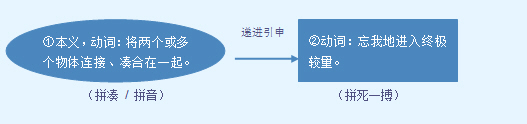 ❶合在一起,连合。可重叠。常作带宾、带补谓语。 ~版|~图案|~衣料|~瓷砖|把两块木板~起来|把“七巧板”~成各种图样|这个字该怎么读,你~一~看|孩子们~~写写,语文水平提高很快。 ❷不顾一切地干,豁出去。作谓语,常带宾语,也可带补语。 ~命|~体力|财主这么心狠,老子和他~了|事到如今,我没有法子可想了,只好同他~了这条老命|这场球赛甲乙两队~了半天没~出个结果|他~到头发白了还不服气。 【词语】 拼搏 拼刺 拼凑 拼盘 拼写 拼音 拼装