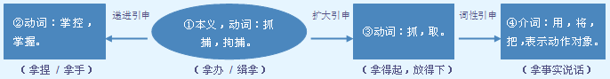 释义 | ![]() 用手取得,握在手里;用手把一件东西从一处转移到另一处: ~起笔来写字|他手里~着杂志|你别把集体的东西~回家。 放 fàng ~下东西|请把书~回去|这个东西容易碎,请轻拿轻~。 用手取、握或搬走;用强力夺取;掌握、决定;捕捉。常作带宾、带补谓语。 手里~着一本书|快把这些乱七八糟的东西~走|我军迅速~下了敌人盘踞的高地|你要~定主意|边防战士在密林中~住三个匪徒。 引进所凭借的工具、材料、方法;引进所处置或关涉的对象。常构成介宾词组作状语。 小华~毛笔誊写|她~绸缎做衣服|他们~事实说明了这个问题|别老是~我开玩笑|大家都~他没办法。 【近】 〈动〉取 握 〈介〉用 【词语】 拿办 拿获 拿架子 拿事 拿手 拿手好戏 拿主意 字源解说 奴,既是声旁也是形旁,表示奴隶。拿,篆文 ![]() ![]() ![]() ![]() 附 文言版《説文解字》:拏,牽引也。从手,奴聲。 附 白话版《说文解字》:拿,牵连拉引。字形采用“手”作边旁,采用“奴”作声旁。 引申线索 ![]() 【字族索引】 拿 合 【同音字】 ná |