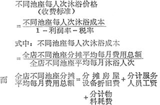 释义 | 沐浴价格 或称“沐浴收费”。 为顾客提供沐浴设备和服务性劳动的收费。一般由成本、利润和税金构成。制订沐浴价格,应根据房屋结构、内部设施、服务质量、社会声誉等因素,合理划分浴池等级、堂口规格,按质分等定价。并对同一等级中的男女淋浴、盆浴、池浴等不同项目和不同季节之间,确定合理的差价和比价。 各等级浴室沐浴价格的计算公式为: |