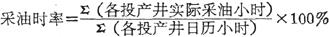 指石油工业在一定时期内投产井的实际生产小时占投产井日历小时的比重。 用百分数表示。反映投产井在时间上利用程度的指标。计算公式为:  式中:实际采油小时数包括:自喷井实际开井时间和间歇自喷井为恢复井底压力而关井时间,以及抽油井实际开井时间和为等待液面上升而关井的时间。 不包括修井、试井、测压、解除事故及其他原因而关井的时间。 新投产井应自投产之日起,计算实际采油小时和日历小时。转注的排液井应从决定转注而停止排液之日起,停止计算日历小时。老井应按全月计算日历小时。 年(季)采油时率等于年(季)中各月投产井实际采油小时数之和除以年(季)中各月投产井日历小时之和。 |