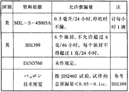 释义 | 油封泄漏量控制 按规定,每开发一个新品种的油封,都需作轴转速为10m/s(有弹簧)或6m/s(无弹簧)的240h连续规律性间断运转试验。即,连续运转20h后停置4h,反复10次的试验。以便观察在试验期间内油封密封性能。 油封的泄漏量控制,在美、英等发达国家都有明确规定,如表26.5-2所示。 表26.5-2 国外骨架油封允许泄漏量 |