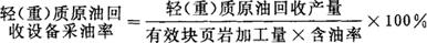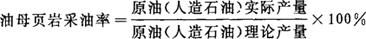 指在一定时期内用油母页岩干馏法制取人造石油的实际产量占理论产量的百分比。 它是反映油母页岩采油技术操作水平和设备条件状况的指标。其计算公式如下:  式中,原油实际产量是指经过脱水处理的净油产量,还包括干馏炉原油产量和干馏气体回收的轻(重)质油产量。 原油理论产量可用下式求得: 原油理论产量=入炉块页岩量×平均含油率 或: 原油理论产量=∑(各批入炉块页岩量×该批含油率) 若一个企业有几种炉型,则可按不同炉型分别进行计算采油率。如:  式中,有效块页岩加工量是指在轻(重)质原油回收设备开动时间内,干馏炉所加工的块页岩的数量。 |