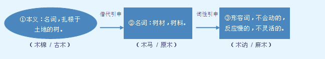 释义 | ![]() 树木;木头。常用于固定词组中,或用作语素构成合成词。 独~不成林|~已成舟|树~|楠~|醒~。 麻木。 a.作谓语。 天太冷,双脚都~了|舌头~了,什么味儿也辨不出。 b.作补语。 水冷得浸骨头,手指都冻~了|时间太长,脚都站~了。 【词语】 木板 木材 木柴 木雕 木耳 木筏 木工 木刻 木料 木乃伊 木讷 木偶 木排 木然 木已成舟 木鱼 字源解说 木,甲骨文 ![]() ![]() ![]() ![]() ![]() ![]() ![]() ![]() ![]() ![]() ![]() ![]() ![]() ![]() 附 文言版《説文解字》:木,冒也。冒地而生。東方之行。从屮,下象其根。凡木之屬皆从木。 附 白话版《说文解字》:木,冒突。冒地而生。五行之中,东方属木。字形采用“屮”作边旁,下部象它的根。所有与木相关的字,都采用“木”作边旁。 引申线索 ![]() 【字族索引】 木 【同音字】 mù |
