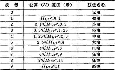 释义 | 波级 波浪波动强度的等级。 是反映风浪或涌浪大小的尺度。波浪愈高,等级愈大。有的将风浪、涌浪分别定级,如“道氏(Douglas)波级”;也有将浪和涌二者依同一标准定级。 中国则采用后者,由0至9分为10个等级,并于1975年3月由国家海洋局公布,如下表。 表中H1/3表示有效波高。 |