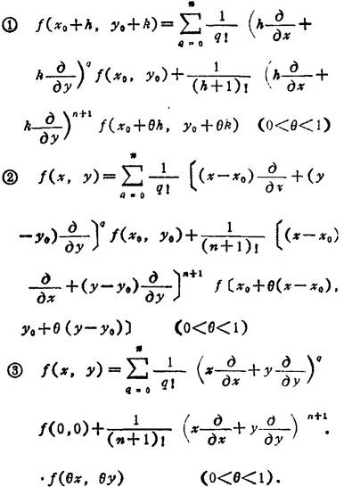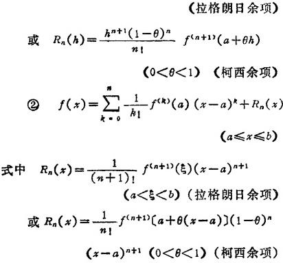 释义 | 泰勒公式 7.6.1 单变量函数的泰勒公式 如果函数f(x)满足条件:(i)在〔a,b〕上有定义,(ii)在此闭区间上有一到n阶的连续导数f′(x),f″(x),… ❸ 特别地, 7.6.2 多变量函数的泰勒公式 假设在点(x0,y0)的邻域D内二元函数f(x,y)有直到n+1阶的一切连续偏导数,当x,y改变后新点(x0+h,y0+k)与旧点(x0、y0)连线线段不越出D外,那么f(x,y)在D内可表为如下形式: |