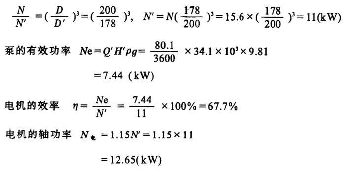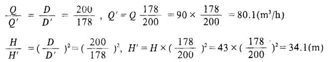 释义 | 泵在其直径改变后性能的变化计算 [例]4B-35型离心泵叶轮直径为200mm,转速为2900r/min,在最大效率点操作时的性能如下:Q=90m3/h,H=43m,N=15.6(kW),η=69%;4B-35a与4B-35型之间,是叶轮的直径由200mm削至178mm,求相同转速下最佳效率点处Q′、H′、N′的值,并求此泵的效率和电机功率。 解:此条件下泵性能的变化符合泵的比例率,故: |