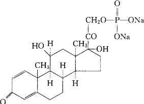 C21H27Na2O8P=484.39 CAS-125-02-0 11β,17,21-三羟孕甾-1,4-二烯-3,20-二酮21-磷酸二钠。 11β,17,21-Trihydroxypregna-1,4-diene-3,20-dione 21-disodium phosphate. 肾上腺皮质激素类药。用于风湿性、过敏性疾病、眼科炎症及外伤、烧伤病人的抢救和治疗。 去氢可的松磷酸二钠,氢化泼尼松磷酸钠。 Prednisolone Sodium Phosphate,Prednisolone Phosphate Disodium,Prednisolone Phosphate Sodium,Disodium Predinsolone 21-Phosphate. 氢化泼尼松磷酸二钠注射液。 BP,USAN,USP,MI.