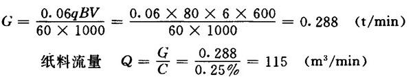 释义 | 流浆箱的压头损失计算 【说明】 以下以日本三菱重工制造的三菱—贝洛依特飘片集流式流浆箱的技改为例进行计算说明,供参考。 流浆箱的压头损失包括三个部分,即管束损失、孔板损失及飘片损失。流浆箱的压头损失见图1-15-87。 1.管束与孔板的压头损失计算 【说明】 管束与孔板的压头损失见图1-15-88。 1-管束压头损失 2-孔板压头损失 2.飘片的压头损失计算 ❶ 计算法 【公式】 式中 △h——压头损失(mH2O) d——飘片间距(mm) Q——流量(m3/min),与喷浆压头、堰口开度及堰唇长度有关,可在图1-15-89中查出 ❷ 查图法 【说明】 如图1-15-89所示,查找飘片压头损失,需先确定三个参数:流量Q、堰口开度B、堰唇长度L。飘片间距d对定型的流浆箱是常数。Q可由产量和流浆箱的浓度计算得来;堰口开度b可根据所选流浆箱的浓度而定;堰唇长度L,可根据著网点的距离定出来。查找飘片压头损失时,先确定堰口开度,然后通过堰唇长度查找流量曲线,即可确定。 【例】 若车速V=600m/min,流浆箱内浆浓c=0.25~0.3%,b=38mm,L=40mm,产品定量为q=80g/m2,堰宽为B=6m时,求飘片的压头损失。 解:纸机产量 取Q=120m3/min,查图1-15-89得△h=0.4mH2O 图1-15-89 飘片压头损失曲线 |