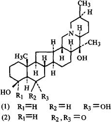释义 | 浙贝母 【名称出处】:《纲目拾遗》 【概况】: 异名 象具、大贝、珠贝(通称)。 基源 为百合科贝母属植物浙贝母的干燥鳞茎。 原植物 浙贝母Fritiliaria thunbergii Miq.(F.verticillata Willd.var.thunbergii(Miq.)Baker) 历史 浙贝载于《纲目拾遗》,据引《百草镜》云:“浙贝出象山,俗呼象贝母。”又引《闇斋》云:“宁波象山所出贝母,亦分两瓣,味苦而不甜,其顶平不尖,不能如川贝之象荷花蕊也。”所述即指本种而言。 形态 多年生草本,高30~80cm,全株光滑无毛。鳞茎扁球形,通常由2片白色肥厚的鳞叶对合而成,直径2~6cm。 茎单一,直立,绿色或带紫色。叶无柄,叶片狭披针形至线状披针形,长6~17cm,宽0.5~1.5cm,茎下部叶对生,中部叶轮生,上部叶互生,先端卷曲。 每株有花1至数朵,花钟状,下垂,生于茎顶或上部叶的叶腋,淡黄色或黄绿色,有时稍带淡紫色;顶生花具苞片3~4,侧生花具苞片2,苞片叶状,先端卷曲;花被片长2.5~3.5cm,宽约1cm,内外轮相似;雄蕊长为花被片的2/5;花药近基著。蒴果长2~2.2cm,宽约2.5cm,棱上有宽6~8mm的翅。花期3~4月,果期5月。(图见《中药志》.第1册.94页.图66) 生境与分布 生于海拔较低的山丘荫蔽处或竹林下。 分布于江苏、安徽、浙江、湖南;浙江宁波及江苏南通地区有大量栽培。日本也有分布。 。【生药】:栽培 宜温和气候,稍耐寒,怕涝。 以土层深厚、排水良好、腐殖质多的砂质壤土为好。用鳞茎繁殖,在9月下旬至10月,选取健壮无病的种茎,按行距20cm开深6~7cm的条沟,以株距10~14cm下种,每亩用种量350kg。栽后覆土,次年春季即可萌芽生长。 浙贝母喜肥,需施足基肥外,还需在入冬时施腊肥,用厩肥、堆肥或人畜粪水追施;早春出苗后,又追肥1次,可用人畜粪水或化肥;在3月下旬摘花后根据苗情,再酌施追肥。 每次施肥应结合中耕除草进行。5月初,植株地上部逐渐枯萎,为使鳞茎安全越夏,可在植株行间套种浅根作物,如黄豆等。 亦可用种子育苗繁殖,经过5年培育后,可作鳞茎繁殖生产。病害灰霉病、黑斑病,用500倍托布津液喷雾或多菌灵防治;干腐病和软腐病,下种前用20%可湿性三氯杀螨砜800倍加80%敌敌畏乳剂2000倍再加40%克瘟散乳剂1000倍液混合浸种10~15分钟。 注意蛴螬、豆芫菁、葱螨等虫害的防治。 采集 立夏后地上部分枯萎时采挖鳞茎,洗净,大小分开,大者分成两瓣,除去芯芽,习称“大贝”或“元宝贝”,小者不分瓣,不去芯芽,习称“珠母”,撞擦除去外皮,拌以煅过的贝壳粉,吸去擦出的浆液,晒干或烘干;或将鲜鳞茎切片晒干。 药材主产于浙江鄞县等地,江苏、安徽也有栽培生产。 鉴别 性状 ❶ 大贝为鳞茎外层的单瓣鳞叶,略呈肾形或菱肉状,高1~2cm,直径2~3.5cm,厚0.6~1.5cm;外表面类白色至淡黄色,内表面白色或淡棕色,被有白色粉末。 质硬脆,断面白色或淡黄白色,粉性。气微,味微苦。 ❷ 珠贝为完整的鳞茎,扁球形,高1~1.5cm,直径1~2.5cm;表面类白色,外层2枚鳞叶肥厚,略呈肾形,相对抱合,中央有2~3枚皱缩的小鳞叶及干缩的细杆状残茎。 以鳞叶肥厚、表面及断面白色、粉性足者为佳。 显微 鳞叶上表皮细胞表面观类多角形、类方形或类长方形,长28~192μm,宽24~70μm,垂周壁较平直。横切面观角质层稍厚,表皮细胞垂周壁部位,角质层向内凸出形成角质栓,其表面观呈颗粒状,于整个垂周壁部位较密,如念珠状。气孔类圆形或扁圆形,长37~64μm,直径46~68μm,副卫细胞3~5个,与周围表皮细胞近等大。(图见药学学报.1991;26(6)∶463~470.图1) 粉末:类白色。 ❶ 淀粉粒极多,单粒长卵形、广卵形、三角状卵形或贝状圆形,直径5~56μm,脐点点状、裂缝状、人字状或马蹄状,位于较小端,层纹明显;复粒稀少,由2~3分粒组成;半复粒稀少。 ❷ 表皮细胞表面观类多角形或长方形,角质层在垂周壁部位向内凸出形成角质栓,呈粗颗粒状,排列较密;气孔扁圆形,副卫细胞4~6个。 ❸ 草酸钙方晶细小,存在于表皮细胞及导管旁薄壁细胞中。 (图见《中药材粉末显微鉴别》.283页.图135) 理化 取样品粉末5g,加氨水2ml、苯20ml,浸渍过夜,滤过,取滤液8ml,置水浴上蒸干,残渣加1ml氯仿溶解,点于硅胶G板上,以浙贝碱、浙贝次碱为对照,以乙酸乙酯-甲醇-浓氨水(17∶2∶1)为展开剂,展距12cm,喷碘化铋钾试液,供试品与对照品在相应的位置上,显相同的橙色斑点。(图见《中药材薄层色谱鉴别》.229页.图150-1) 贮藏 置通风干燥处,防蛀。。【化学】: 含多种甾醇类生物碱:浙贝甲素(1)(Peimine,Verticine)、浙贝乙素(2)(Peiminine,Verucinone)、新的生物碱浙贝宁(Zhebeinine,5α、14α-Cevanine-3β,6α,20β-trial),被认为是浙贝甲素27-CH3的差向异构体[1],首次从浙贝中分得的Eduardine和新生物碱浙贝丙素(Zhebeirine,5α,14α-Cevanine-3β-hydroxy-6-one)[2]和微量新生物碱浙贝酮(Zhebeinone,5α,14α-Cevanine-3β,20β-dihydroxy-6-one),为浙贝乙素27-CH3的差向异构体、浙贝宁6位羟基的氧化物[3],另一种新的3,7-二氧杂环〔3,3,O〕辛酮-6类化合物,其结构为2(3′,5′-Dimethyoxy-4′-hydroxyphenyl)-3,7-dioxabicyclo〔3,3,O〕octan-6-one),定名为浙贝素(Zhebeiresinol)[4]。 从新鲜鳞茎中分得浙贝宁、浙贝甲素,对映-贝壳杉烷-16β,17-二醇、β-谷甾醇和胡萝卜素[5],从日本栽培的中国浙贝新鲜鳞茎中分得Isopimaran-19-ol、Isopimaran-19-oic acid(以甲酯形式存在)、对映-贝壳杉烷-16β,17-二醇(ent-Kauran-16β,17-diol)、对映-贝壳杉烷-16α,17-二醇、对映-16β,17-环氧-贝壳杉烷、对映-16α-甲氧基-贝壳杉烷-17-醇和对映贝壳杉-15-烯-17-醇(ent-Kaur-15-en-17-ol)[6]。
