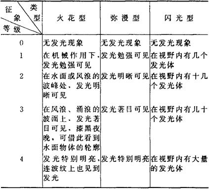 海发光有3种类型,每种类型又分为5个等级(见表)。由于海发光的存在,船舶在夜间航行时,可留下明亮的尾迹,这在军事上有重要意义。