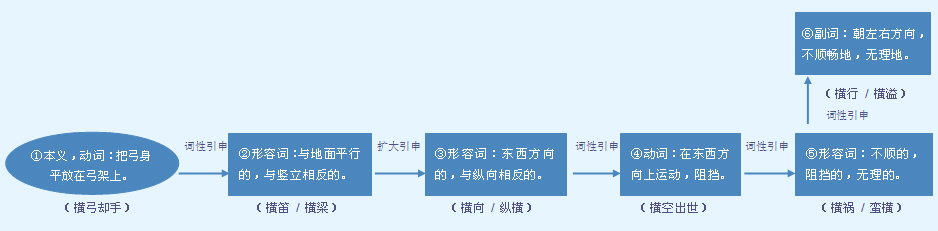 释义 | ![]() ❶ 与地面平行的: ~梁|~木|~吹笛子|别把柜子~放在地上。 竖 shù ~琴|~立|~井|横着不行,要~着放|一听那事,他气得头发都~了起来。 直 zhí ~立|~升飞机|~冲云霄|飞流~下三千尺,疑是银河落九天。 ❷ 地理上东西走向的: ~贯东西|哥伦布~跨大西洋发现了美洲大陆。 纵 zòng ~向行驶|京沪高速公路是我国交通大动脉三~里面的一条。 ❸ 左右方向的: ~坐标|阡陌纵~|请你~着数过去,看看究竟是多少个人。 竖 shù 横七~八|古代书信是~写的。 直 zhí 不采用~行书写|屋子较深,~里有六米多。 纵 zòng ~坐标|排成二路~队|从那里~插进去。 ❹ 跟物体长的一边垂直的: ~切面|人行~道。 竖 shù 这瓜你别~着切。 纵 zòng ~断面|将瓜~切成两半。 ❺ 汉字一种笔画,从左向右平着写: 写汉字要~平竖直。 竖 shù 一横一~就是“十”字。 ❶从左到右,或从右到左;也指使物体变成横向。作带宾、带补谓语,也可构成连动词组作谓语。 一队飞机~过我们的头顶|汽车出了事故,正~在公路上|把写字台~过来|大炕上~着躺了五个人。 ❷下定决心不顾一切。可带动态助词“了”。可作带宾、带补谓语。 只要~了心,什么顾虑也没有了|老余~下一条心,把最后五分地抵押了出去|他心一~,决定不去了。 跟地面平行的(与“竖”“直”相对);地理上东西向的(与“纵”相对)。非谓形容词。 a.作定语。 这是一条条~的边界线|前面那条~的马路就是长安街。 b.作状语。 这张照片应该~拍|一张精致的茶几~放在沙发前面|血肉~飞。 c.用在“是……的”格式中。 经线是直的,纬线是~的。 汉字的笔画,平着由左向右。作主语、宾语。 ~是汉字的一种基本笔画|这个字的第二笔是~|他在错字下面画了一~。 【反】 〈形〉直 竖 纵 【词语】 横波 横渡 横队 横幅 横亘 横贯 横加 横眉 横眉怒目 横批 横七竖八 横肉 横扫 横生 横生枝节 横竖 横心 横行 横行霸道 【注意】 又读hèng,如:说横话、强横、横祸。 字源解说 黄,甲骨文 ![]() ![]() ![]() ![]() 附 文言版《説文解字》: 横,闌木也。从木,黃聲。 附 白话版《说文解字》: 横,栏杆。字形采用“木”作边旁,“黄”是声旁。 引申线索 ![]() 【字族索引】 黄 【同音字】 héng hèng |