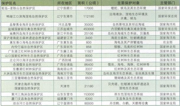 释义 | 海洋环境 中国拥有1.8万公里的大陆海岸线和300多万平方公里的海洋,近海海域划分为渤海、黄海、东海和南海4个海区;生态系统多种多样,主要包括河口、海湾、滨海湿地、红树林、珊瑚礁、海岛等具有典型性、代表性的生态系统。 海洋环境的有效保护已成为中国经济社会和环境可持续发展的重要基础。中国已经基本形成了海洋环境保护的法律体系和行政执法体系,构建了海洋环境监测网络,制定和实施了海洋功能区划、近岸海域环境功能区划,合理开发和保护海洋资源,防止海洋污染和生态破坏,促进海洋经济可持续发展。 国家级海洋自然保护区一览表 |