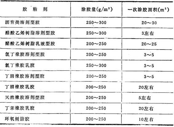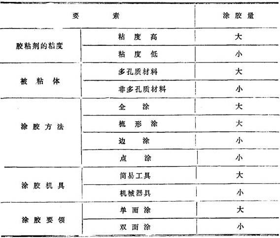 涂胶时,胶粘剂的涂胶量系指单位面积的粘接面上所消耗胶粘剂的数量。涂胶量由于所使用的胶粘剂种类、被粘体的材质、涂胶方法等的不同,统一确定是比较困难的。表3-13示出各种因素对涂胶量的影响。 表3-13 涂胶量的大小  胶粘剂厚度原则上越薄越好,但是缺胶现象不应该存在,由于被粘体的材质和形状不同,为了不使涂胶层遗漏,有时需要涂2~3遍,重复涂胶时,头遍涂胶后,不必停留过长时间,可紧接著重复涂敷。 值得指出的是,涂胶量和胶层厚度不一定是比例关系,胶粘剂使用量还取决于被粘材料的性质以及它们之间修合情况等。例如多孔性的混凝土、木材、泡沫塑料等制件,胶粘剂的使用量就比金属材料粘接时要多。 表3-14为单面涂胶用量参考表。双面涂胶时每一面涂胶量比单面涂胶用量减少2~3成。 表3-14 涂胶量标准参考表  |