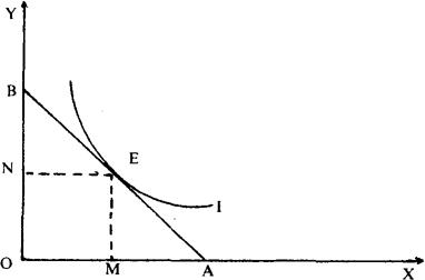 西方经济学关于消费者如何实现最大的满足程度的理论。 它所研究的是消费者如何把有限的收入在可买到的商品间作合理的配置以求得最大的效用,这个问题的解决被称为消费者均衡。在确定消费者均衡方面,西方经济学家先后采用边际效用分析法和无差异曲线、消费可能线分析法两种分析方法。边际效用分析法是早期西方经济学家分析消费者均衡的方法。 它的原则是:如果消费者的货币收入是固定的,市场上各种物品的价格也是既定的,那么,消费者一定要使他花出的每一单位货币所获得的边际效用都相等。 按照这一原则实现的购买,就可以达到消费者均衡。无差异曲线、消费可能线分析法,是在同一个座标图上同时画出无差异曲线和消费可能线,两线相切于一点,由切点所决定的商品组合即可实现消费者均衡。 图中,AB是消费可能线,I是无差异曲线,两线相切于E点,E点所确定的不同商品组合可以实现消费者均衡。因为E点既在消费可能线上,又在无差异曲线上,在前者上说明购买该种组合的商品为现有货币收入所许可,在后者上说明购买该种组合的商品可以达到效用最大化。 两个条件结合起来便实现了消费者均衡,即使消费者行为达到最佳境界。  〔参〕 消费可能线 无差异曲线 |