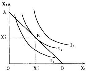 任何一个理性的消费者在用一定的收入购买商品时,其目的是为了从中获得尽可能大的效用。 以两种商品为例,在附图中,AB线段表示在某消费者收入既定和商品价格已知条件下的预算线,I1、I2和I3曲线表示在该消费者的无数条无差异曲线中具有代表性的三条。现在的问题是:消费者应该如何选择两种商品的购买数量(X1、X2),才能获得最大的效用水平? 图中既定的预算线AB和其中一条无差异曲线I2相切于E点,则E点就是在既定收入约束条件下消费者能够获得最大效用水平的均衡点。 在切点E,无差异曲线I2和预算线AB的斜率是相等的。由于无差异曲线的斜率的绝对值可以用商品的边际替代率来表示,预算线的斜率的绝对值可以用两商品的价格之比来表示,所以,在E点有:RCS1,2=P1/P2  这就是消费者效用最大化的均衡条件。 它表示:在一定的收入约束条件下,为了得到最大的消费满足,消费者选择购买的最优商品数量组合,应使得两种商品的边际替代率等于两商品的价格之比。也可以说,它表示:在消费者的均衡点上,消费者愿意用一单位的某种商品去交换另一种商品的数量应该等于该消费者能够在市场上用一单位的这种商品去交换另一种商品的数量。 |